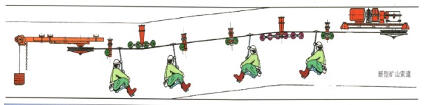 礦用索道(架空乘人裝置)主要用于礦井斜巷,平巷運送人員,其工作原理類似于地面旅游索道。它通過電動機帶動減速機上的摩擦輪作為驅動裝置,采用架空的無極循環的鋼絲繩作為牽引承載。鋼絲繩主要靠尾部張緊裝置進行張緊,沿途依托繩輪支撐,以維持鋼絲繩在托輪間的饒度和張力。抱索器將乘人吊椅與鋼絲繩連接并隨之作循環運行從而實現運送人員的目的。