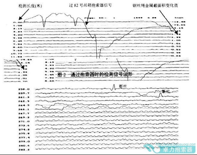 圖2為蘇仙嶺索道采集到的鋼絲繩檢測信號波形。可以看出,當檢測傳感器通過抱索器時,檢測信號在波形上表現為突變信號。突變信號沿鋼絲繩軸向分布的長度為抱索器和2倍的檢測傳感器長度的總和,因而,這段長度的鋼絲繩將無法檢測而成為檢測的盲區。然而,抱索器固定處的鋼絲繩易于產生疲勞破壞,為了防止該區段鋼絲繩先期折斷,必須定期移動抱索器的固定位置。在不拆抱索器的情況對鋼絲繩進行檢測,為了防止漏檢,必須對整根鋼絲繩進行兩次檢測,第一次檢測檢測后,將抱索器相對于原安裝位置移動一段距離后安裝,露出抱索器覆蓋了的鋼絲繩段,進行第二次檢測。根據這一要求,安裝有固定抱索器的鋼絲繩,其檢測的時間最好安排在每次移抱索器前后進行,以可以減少勞動強度。對于該形式的索道鋼絲繩檢測,有兩種檢測方法,一種方法是采用普通鋼絲繩檢測傳感器,當遇到吊廂時,可停住索道,拆下傳感器跳過抱索器安裝在吊廂的另一側再運行索道進行檢測。由于吊廂數量不多,移動傳感器的工作量不是很大,檢測花費的輔助時間較少。