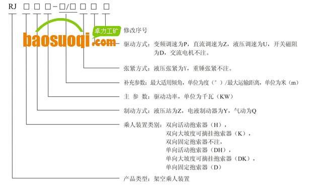 第二代架空乘人裝置型號示例:采用液壓傳動、液壓制動和液壓張緊、最大適用傾角13°、最大運輸距離1600m、驅動功率為45KW的活動抱索器架空乘人裝置。其型號表示為:RJHZ45-13/1600YU(A)。